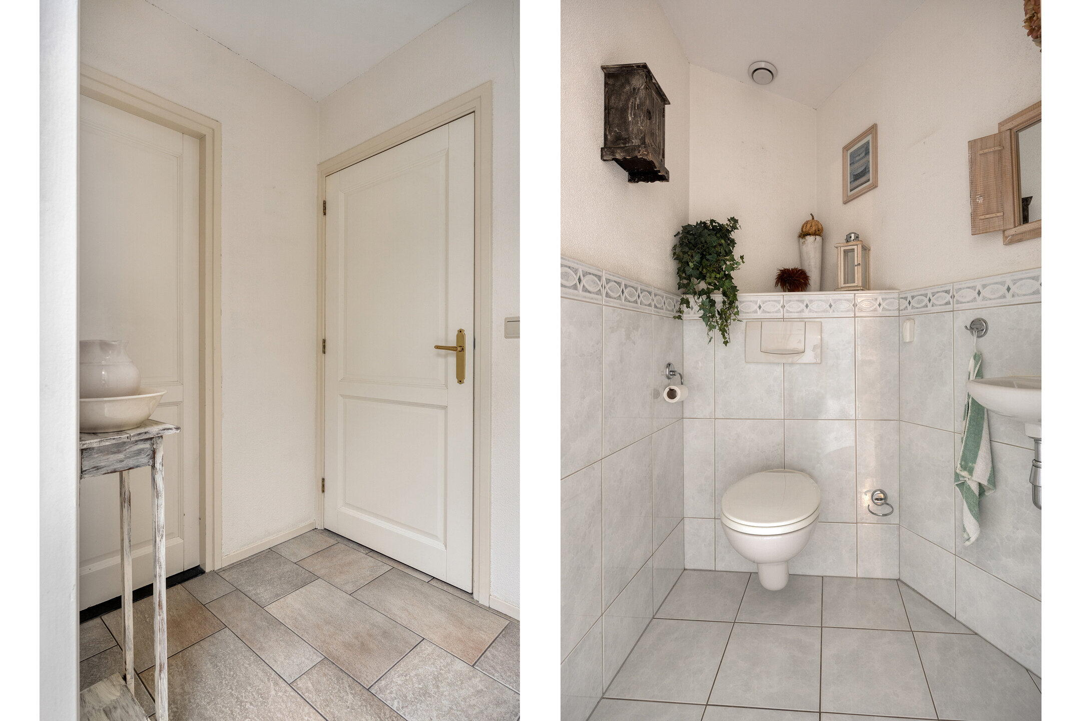 Achter de keuken bevindt zich een tussenportaal met toegang tot de separate toiletruimte, de badkamer en de garage. De toiletruimte is voorzien van een wandcloset en fontein. De badkamer (ca. 3.55 x 1.69 m) is uitgerust met een ligbad, douchecabine, wastafel, designradiator en een dakraam voor natuurlijke ventilatie.