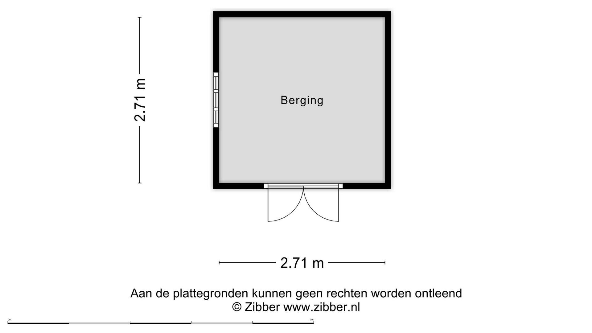 De vrijstaande houten berging (ca. 2.71 x 2.71 m) is voorzien van elektra en biedt ruimte voor fietsen, tuingereedschap en opslag.